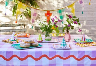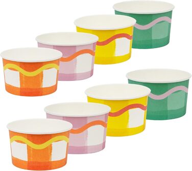 В комплекте – 8 бумажных стаканчиков, изготовленных по заказу, объемом 230 мл. В четырех приятных цветах: оранжевом, сиреневом, желтом и зеленом, все с принтом в большую клеточку. Контрастная волнистая кайма обеспечивает игривый вид.