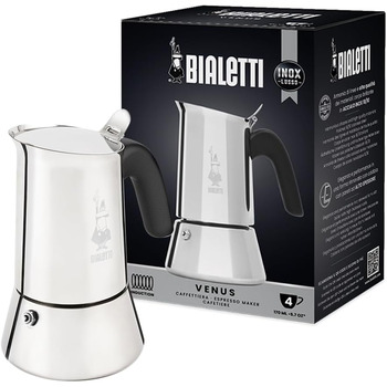 Venus Bialetti предлагает максимальную прочность и рассчитана на долговечность: в новой модели толщина стенки бойлера увеличена на 20%, что обеспечивает высокую производительность и надежность, гарантируя максимальное качество. Кофеварка изготовлена из нержавеющей стали 18/10 для совместимости с индукционными варочными поверхностями и сохраняет свою яркость и начальные характеристики даже после продолжительного использования.
